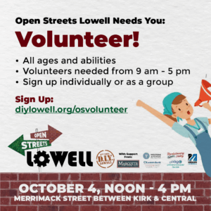 We would greatly appreciate anyone who can spare some time to assist with Open Streets Lowell on October 4 from 9 am to 5 pm.